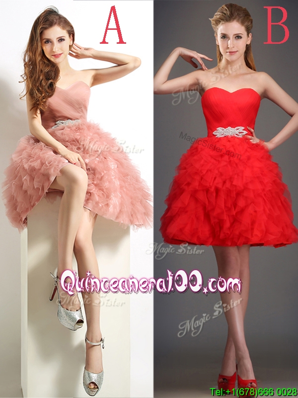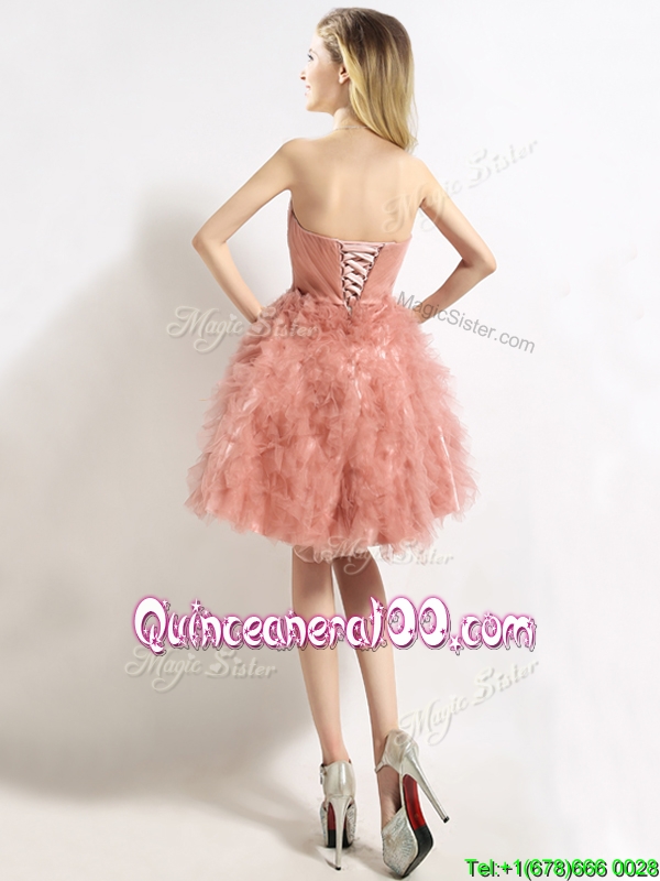 Neckline : SweetheartShown Color : Red,PeachSleeve Length : sleevelessHemline : mini lengthBack Detail : Lace upFabric : TulleEmbellishment : Beading,RufflesOccasion : Prom,PartySeason : Spring,Summer,Fall