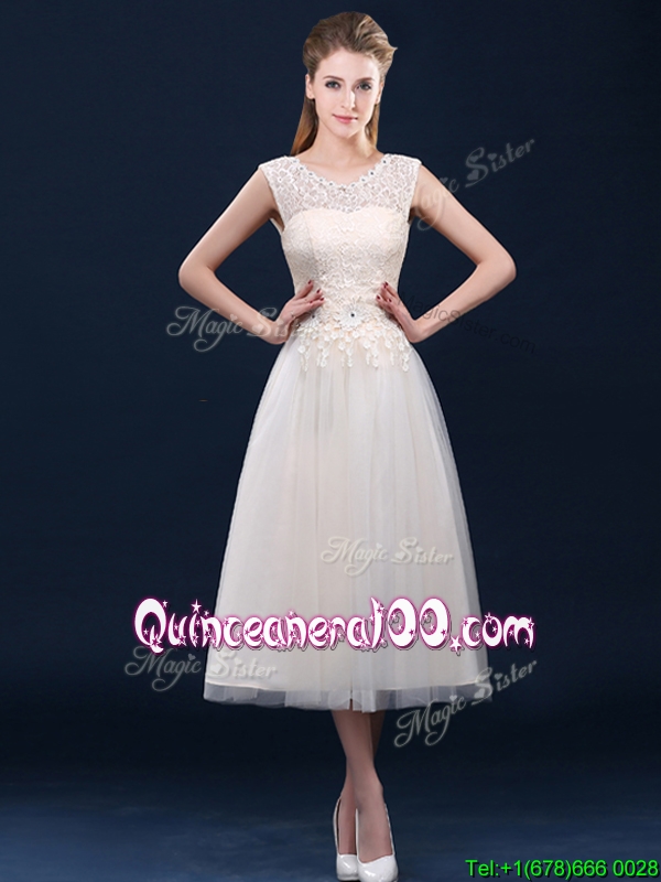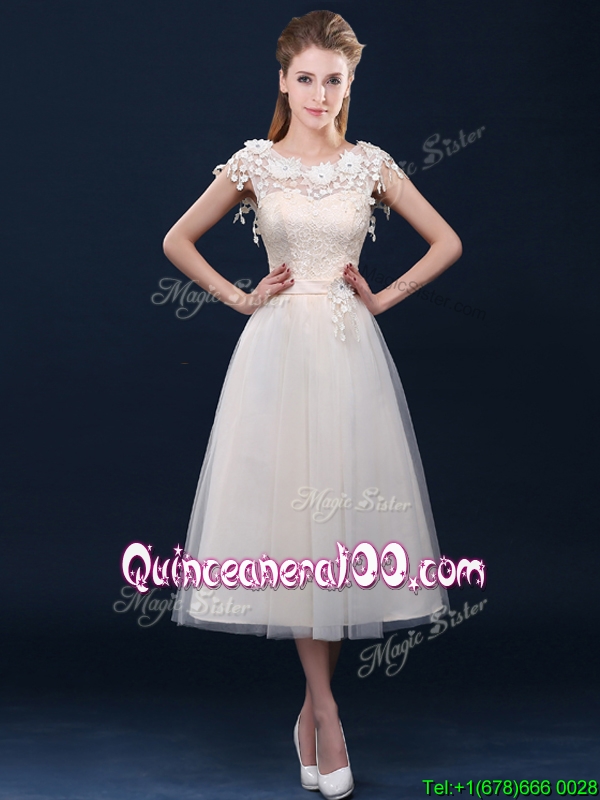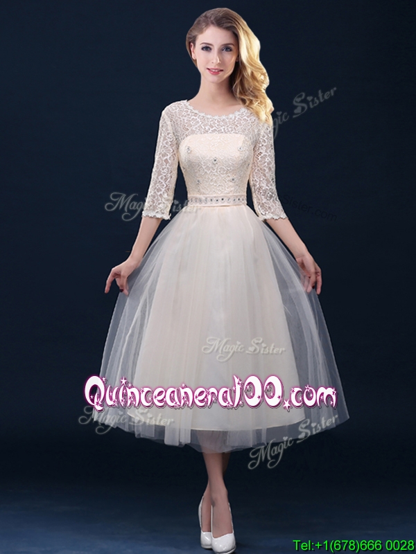 Neckline : ScoopShown Color : ChampagneSleeve Length : 3|4 length sleeveHemline : tea lengthBack Detail : Lace upFabric : TulleEmbellishment : Lace,Appliques,BeltOccasion : Prom,PartySeason : Spring,Summer,Fall,Winter
