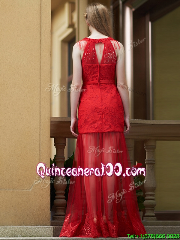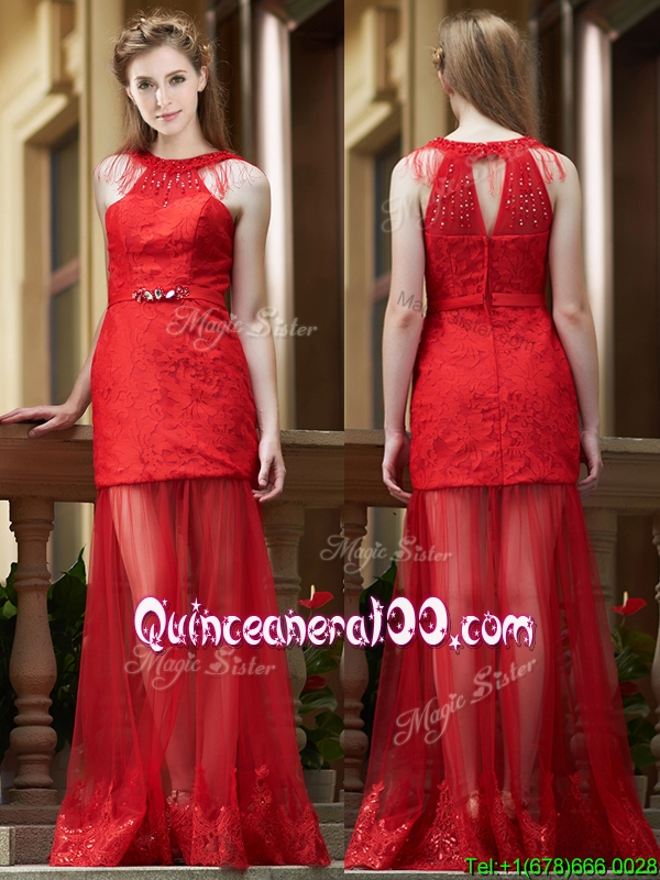 Neckline : Halter topShown Color : RedSleeve Length : sleevelessHemline : floor lengthBack Detail : ZipperFabric : Tulle,LaceEmbellishment : Beading,BeltOccasion : Prom,PartySeason : Spring,Summer,Fall,Winter
