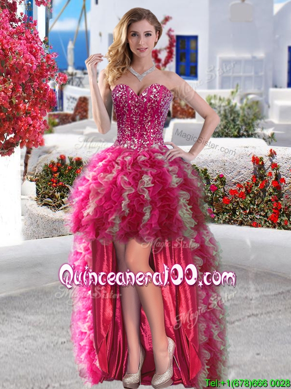 Neckline : SweetheartShown Color : Hot Pink,ChampagneSleeve Length : sleevelessHemline : floor lengthBack Detail : Lace upFabric : OrganzaEmbellishment : Beading,RufflesOccasion : Military Ball,Sweet 16,QuinceaneraSeason : Spring,Summer,Fall,Winter