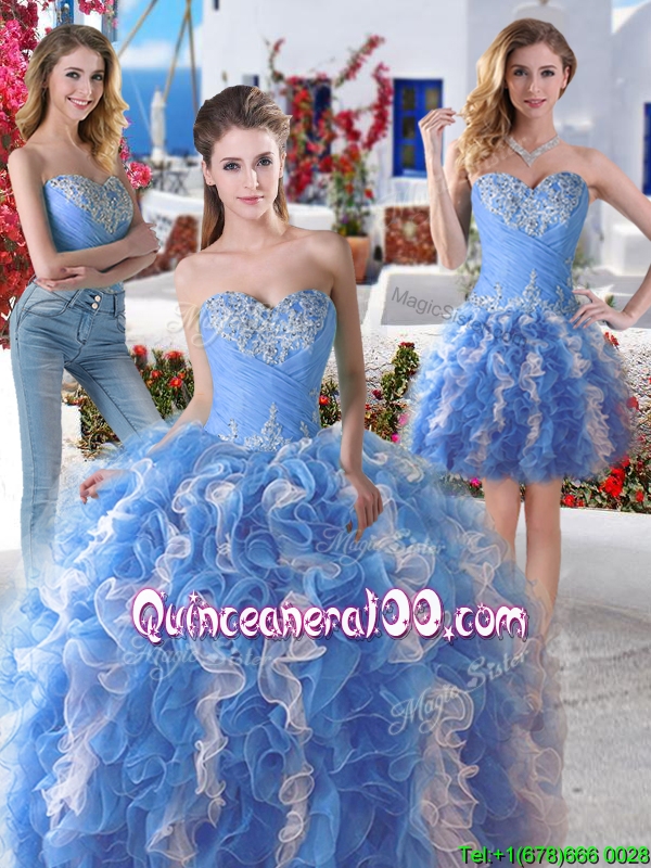 Neckline : SweetheartShown Color : White,BlueSleeve Length : sleevelessHemline : floor lengthBack Detail : Lace upFabric : OrganzaEmbellishment : Appliques,RufflesOccasion : Military Ball,Sweet 16,QuinceaneraSeason : Spring,Summer,Fall,Winter