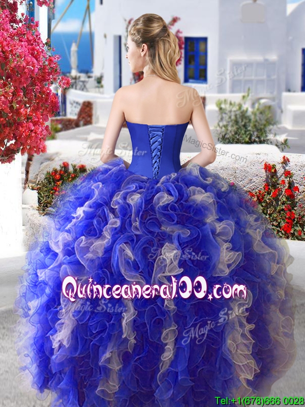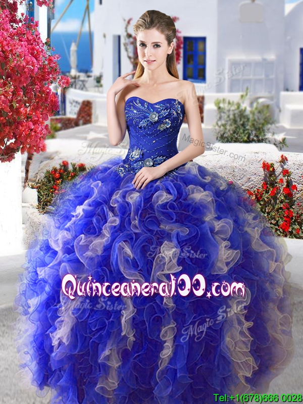 Neckline : SweetheartShown Color : Royal Blue,ChampagneSilhouette : Ball GownsSleeve Length : sleevelessHemline : floor lengthBack Detail : Lace upFabric : OrganzaEmbellishment : Appliques,RufflesOccasion : Military Ball,Sweet 16,QuinceaneraSeason : Spring,Summer,Fall,Winter