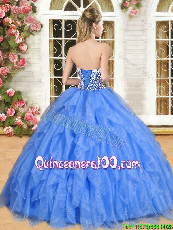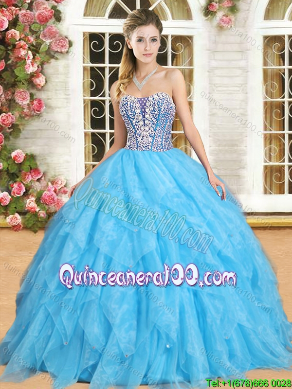 Neckline : SweetheartShown Color : Aqua BlueSilhouette : Ball GownsSleeve Length : sleevelessHemline : floor lengthBack Detail : Lace upFabric : OrganzaEmbellishment : Beading,RufflesOccasion : Military Ball,Sweet 16,QuinceaneraSeason : Spring,Summer,Fall,Winter