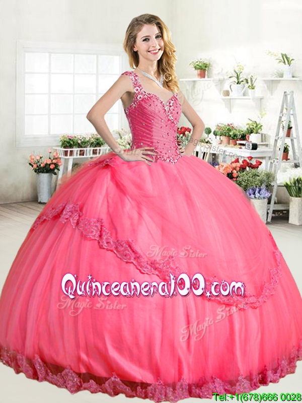 Neckline : StrapsShown Color : Hot PinkSilhouette : Ball GownsSleeve Length : sleevelessHemline : floor lengthBack Detail : Lace upFabric : TulleEmbellishment : Beading,AppliquesOccasion : Military Ball,Sweet 16,QuinceaneraSeason : Spring,Summer,Fall,Winter