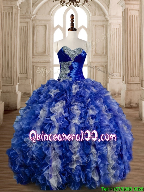 Neckline : Sweetheart Shown Color : Blue And White Silhouette : Ball Gowns Sleeve Length : sleeveless Hemline : floor length Back Detail : Lace up Fabric : Organza Embellishment : Beading,Ruffles Occasion : Military Ball,Sweet 16,Quinceanera Season : Spring,Summer,Fall,Winter