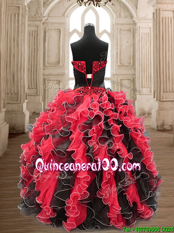 Neckline : SweetheartShown Color : Red And BlackSilhouette : Ball GownsSleeve Length : sleevelessHemline : floor lengthBack Detail : BacklessFabric : OrganzaEmbellishment : Beading,RufflesOccasion : Military Ball,Sweet 16,QuinceaneraSeason : Spring,Summer,Fall,Winter