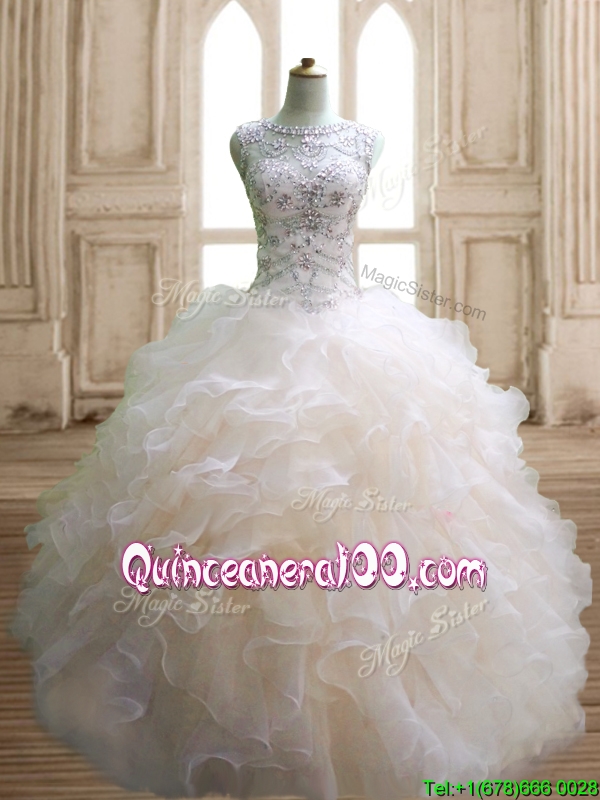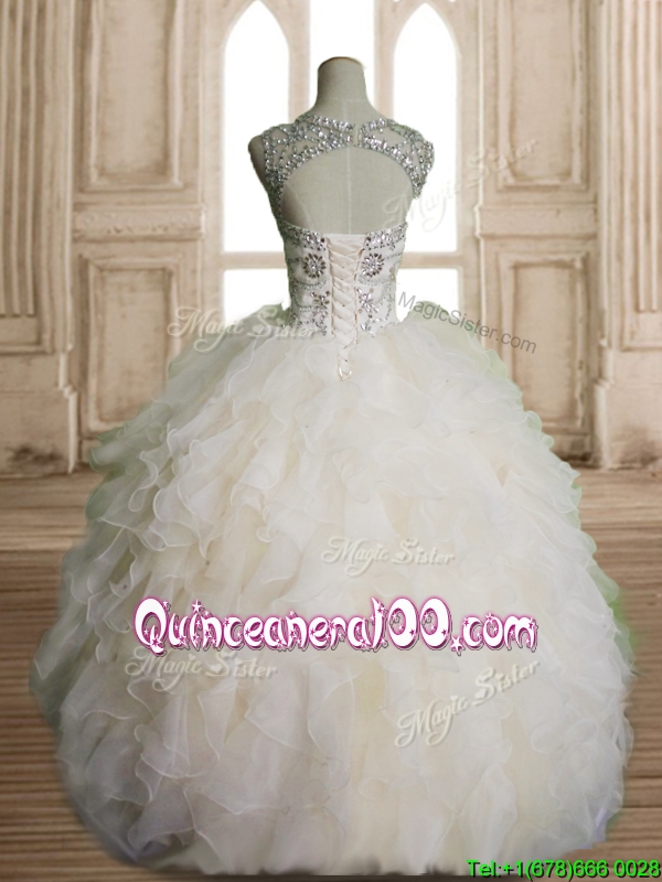 Neckline : ScoopShown Color : ChampagneSilhouette : Ball GownsSleeve Length : sleevelessHemline : floor lengthBack Detail : Lace upFabric : OrganzaEmbellishment : Beading,RufflesOccasion : Military Ball,Sweet 16,QuinceaneraSeason : Spring,Summer,Fall,Winter