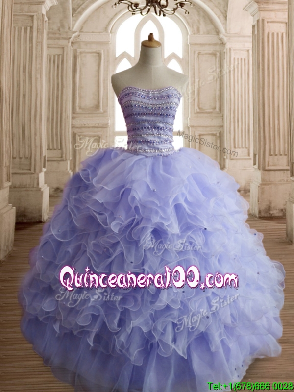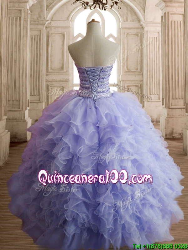 Neckline : SweetheartShown Color : LavenderSilhouette : Ball GownsSleeve Length : sleevelessHemline : floor lengthBack Detail : Lace upFabric : OrganzaEmbellishment : Beading,RufflesOccasion : Military Ball,Sweet 16,QuinceaneraSeason : Spring,Summer,Fall,Winter