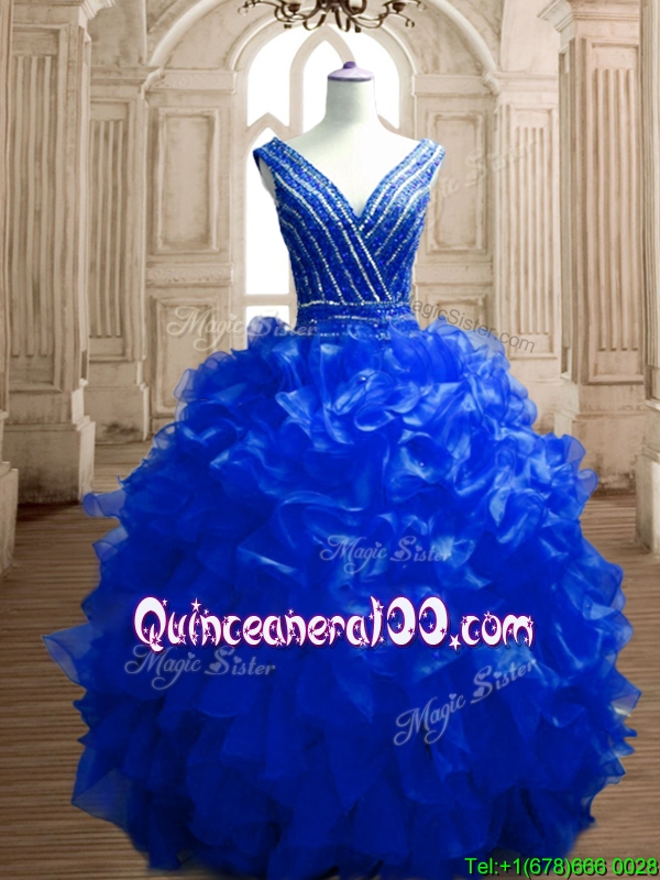 Neckline : V-neckShown Color : Royal BlueSilhouette : Ball GownsSleeve Length : sleevelessHemline : floor lengthBack Detail : ZipperFabric : OrganzaEmbellishment : Beading,RufflesOccasion : Military Ball,Sweet 16,QuinceaneraSeason : Spring,Summer,Fall,Winter