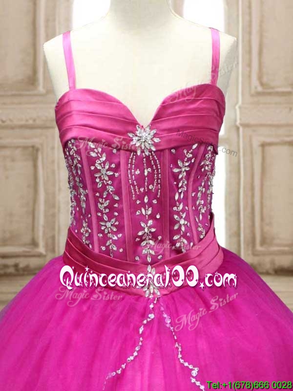 Neckline : Spaghetti strapsShown Color : FuchsiaSilhouette : A-lineSleeve Length : sleevelessHemline : floor lengthBack Detail : ZipperFabric : TulleEmbellishment : Beading,AppliquesOccasion : Military Ball,Sweet 16,QuinceaneraSeason : Spring,Summer,Fall,Winter