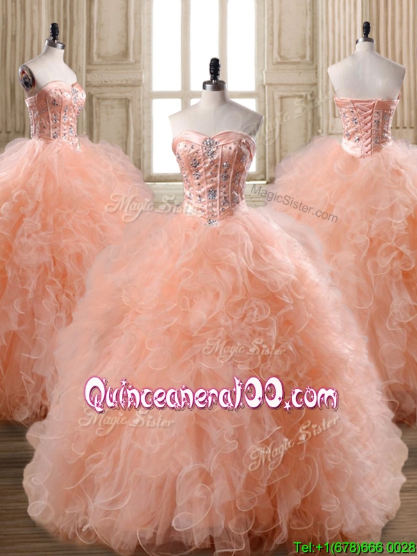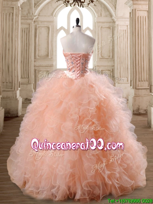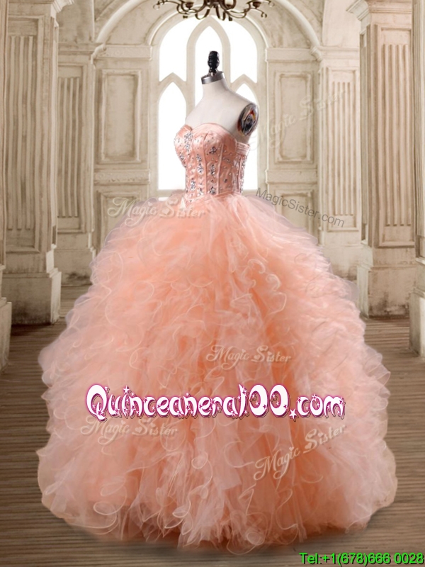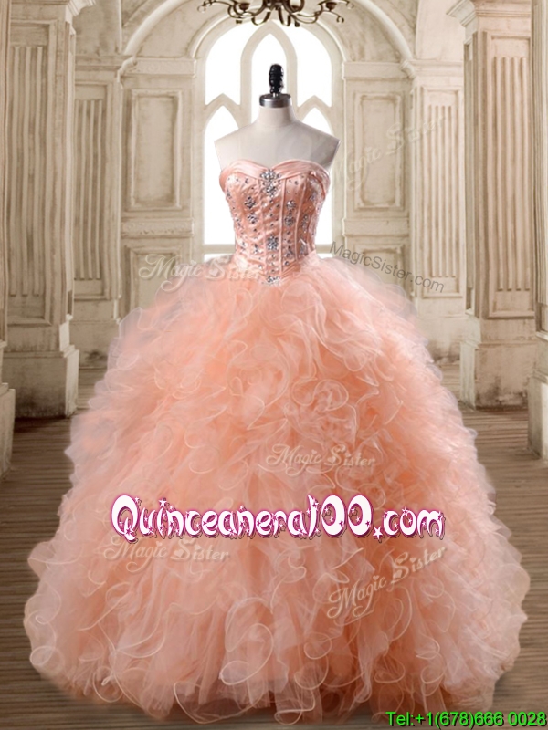 Neckline : SweetheartShown Color : PeachSleeve Length : sleevelessHemline : floor lengthBack Detail : Lace upFabric : TulleEmbellishment : Beading,RufflesOccasion : Military Ball,Sweet 16,QuinceaneraSeason : Spring,Summer,Fall,Winter