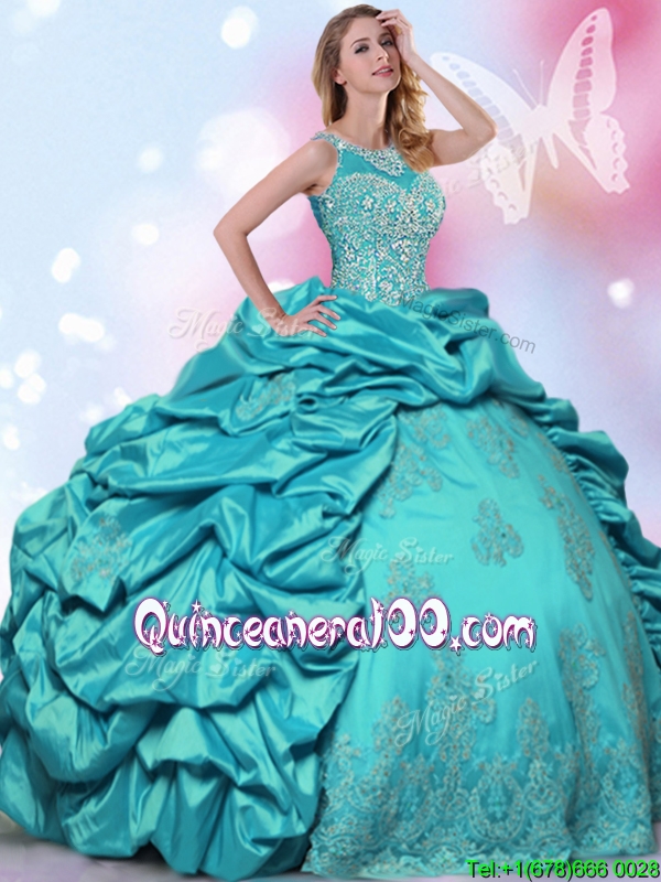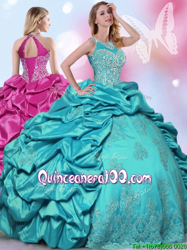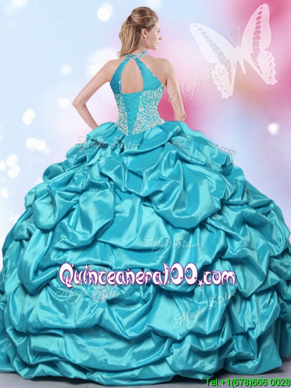Neckline : Halter topShown Color : TurquoiseSilhouette : Ball GownsSleeve Length : sleevelessHemline : floor lengthBack Detail : Lace upFabric : TaffetaEmbellishment : Beading,Lace,Pick UpsOccasion : Military Ball,Sweet 16,QuinceaneraSeason : Spring,Summer,Fall,Winter