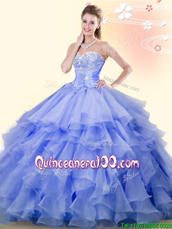 Neckline : SweetheartShown Color : LavenderSilhouette : Ball GownsSleeve Length : sleevelessHemline : floor lengthBack Detail : Lace upFabric : OrganzaEmbellishment : Beading,RufflesOccasion : Military Ball,Sweet 16,QuinceaneraSeason : Spring,Summer,Fall,Winter