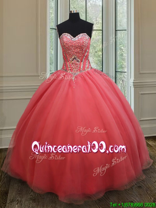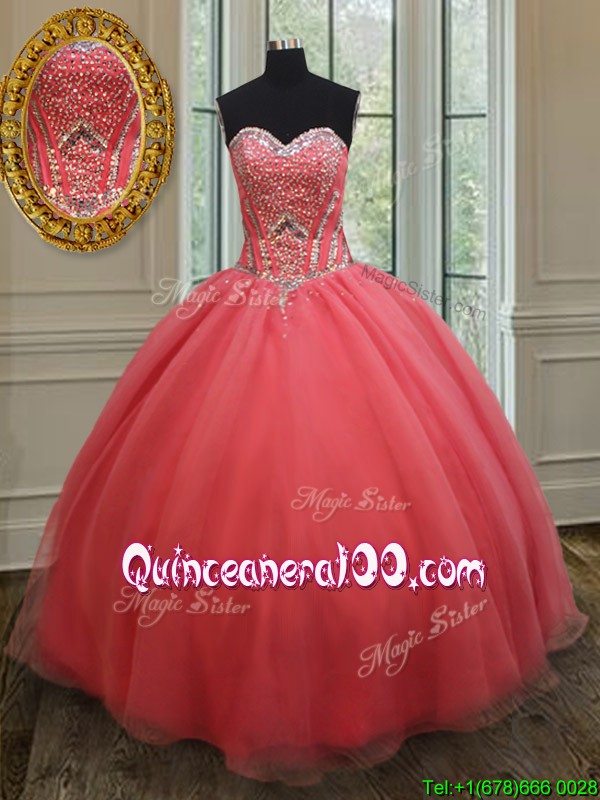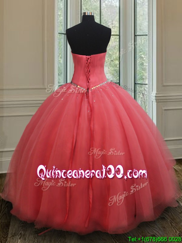 Neckline : SweetheartShown Color : Watermelon RedSilhouette : Ball GownsSleeve Length : sleevelessHemline : floor lengthBack Detail : Lace upFabric : OrganzaEmbellishment : BeadingOccasion : Military Ball,Sweet 16,QuinceaneraSeason : Spring,Summer,Fall,Winter