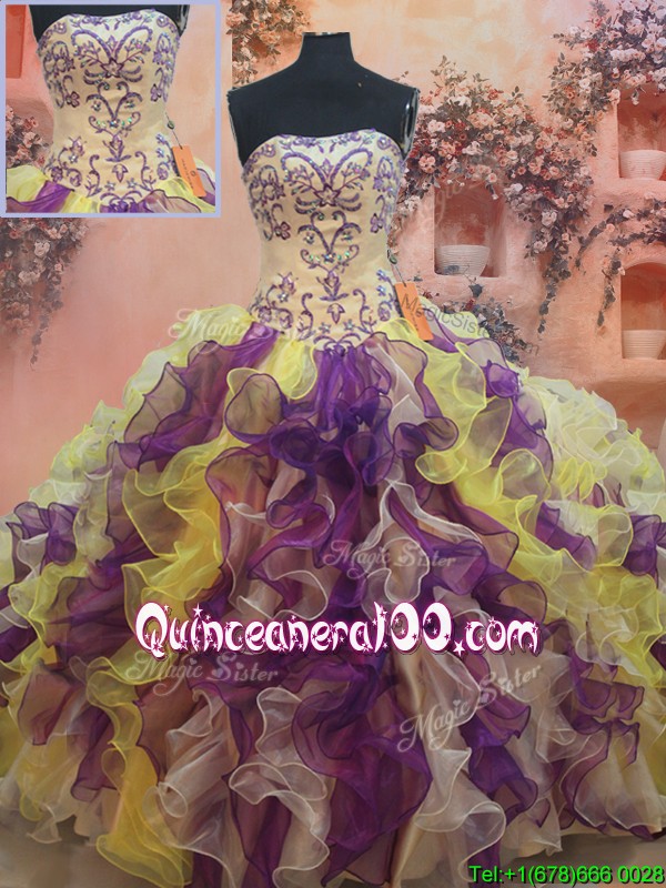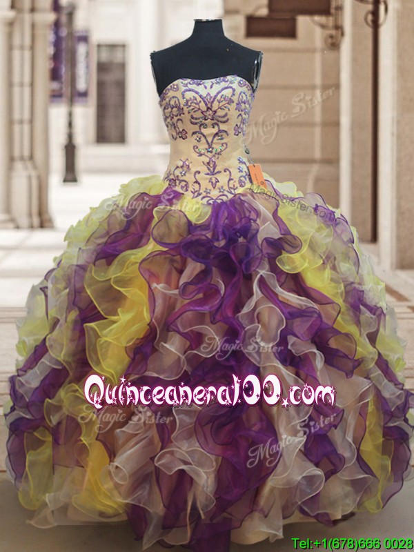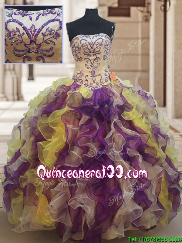 Neckline : StraplessShown Color : Multi-colorSilhouette : Ball GownsSleeve Length : long sleevesHemline : floor lengthBack Detail : Lace upFabric : OrganzaEmbellishment : Beading,RufflesOccasion : Military Ball,Sweet 16,QuinceaneraSeason : Spring,Summer,Fall,Winter