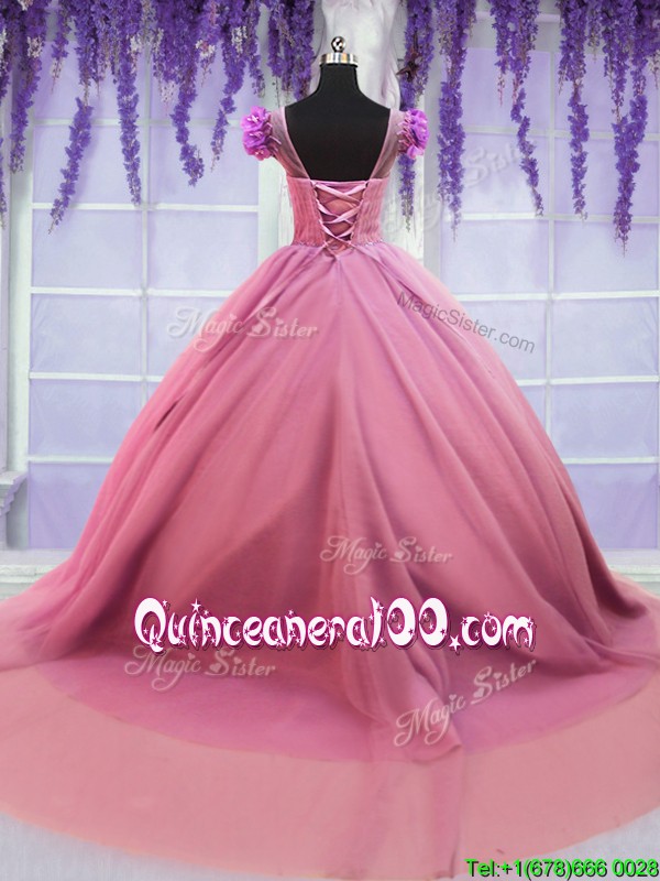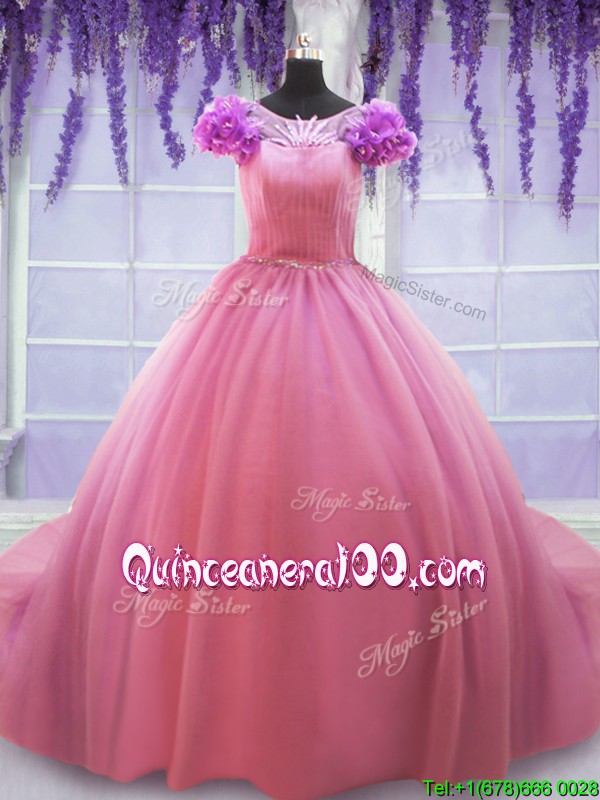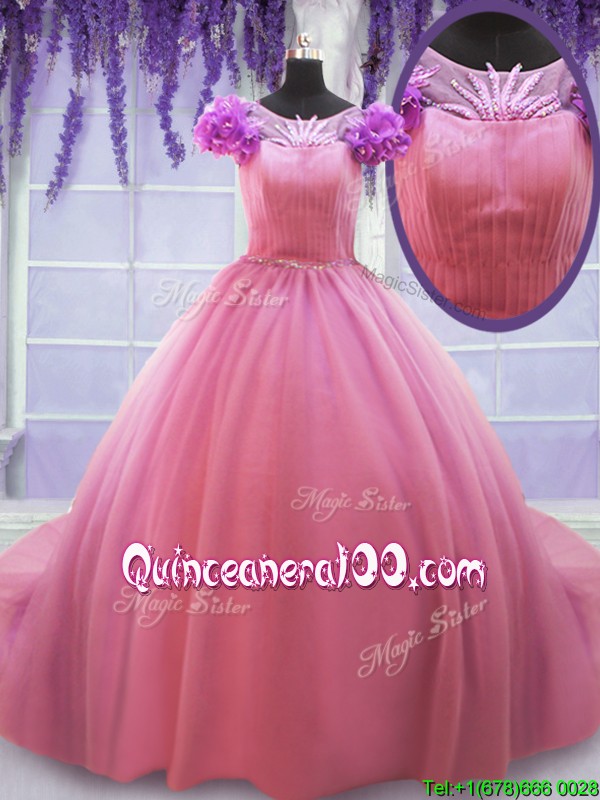 New Style Beaded Scoop Cap Sleeves Rose Pink Quinceanera Dress with Court Train