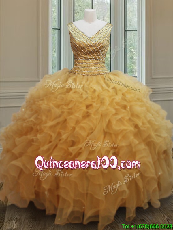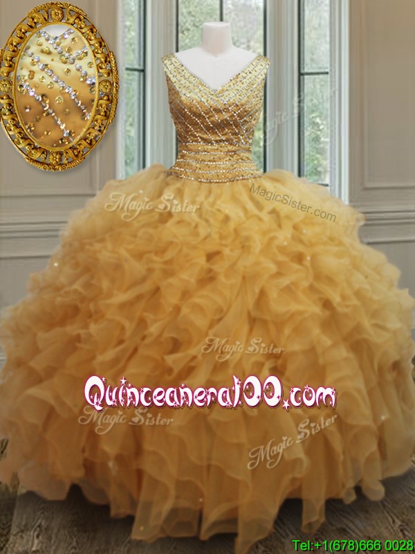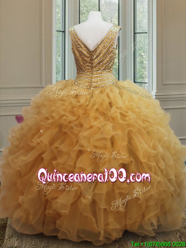 Neckline : V-neckShown Color : GoldSilhouette : Ball GownsSleeve Length : sleevelessHemline : floor lengthBack Detail : ZipperFabric : OrganzaEmbellishment : Beading,RufflesOccasion : Military Ball,Sweet 16,QuinceaneraSeason : Spring,Summer,Fall,Winter