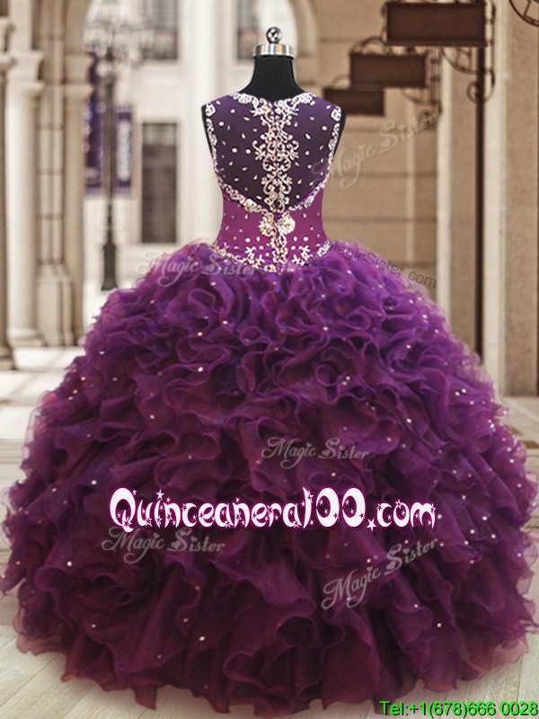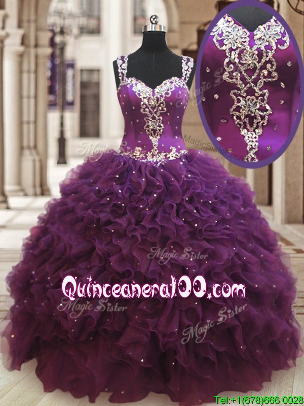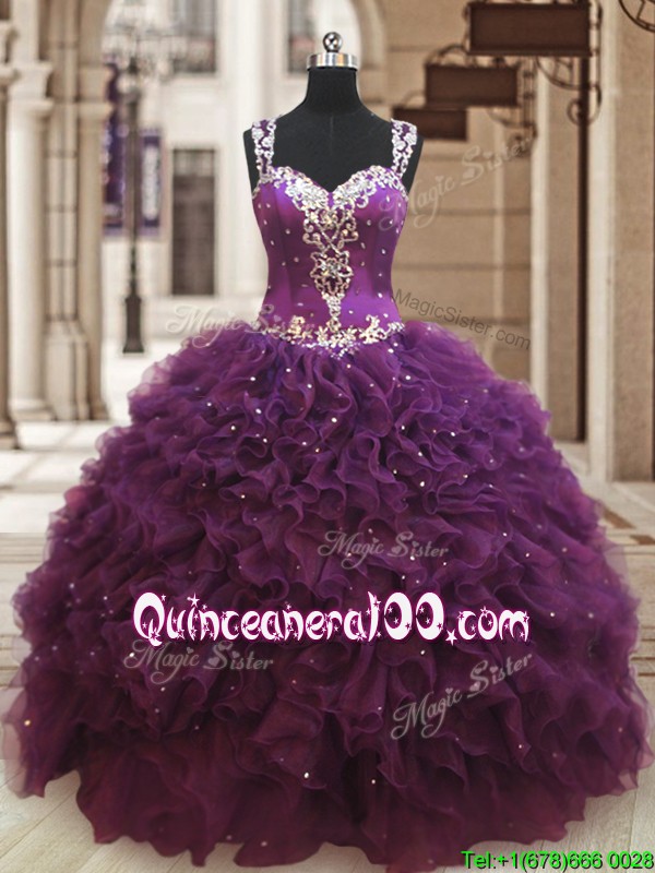 Neckline : StrapsShown Color : Dark PurpleSilhouette : Ball GownsSleeve Length : sleevelessHemline : floor lengthBack Detail : ZipperFabric : OrganzaEmbellishment : Beading,RufflesOccasion : Military Ball,Sweet 16,QuinceaneraSeason : Spring,Summer,Fall,Winter