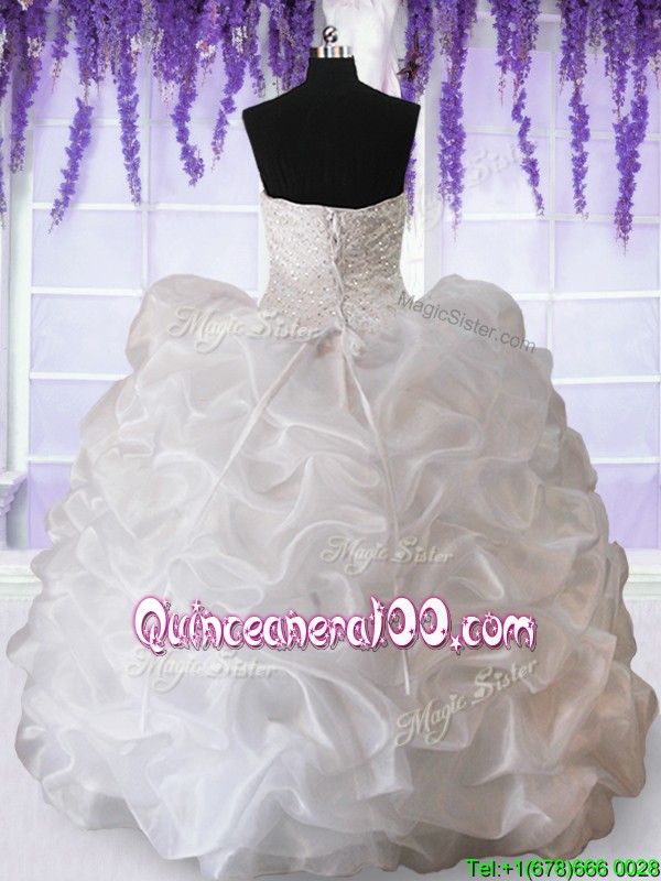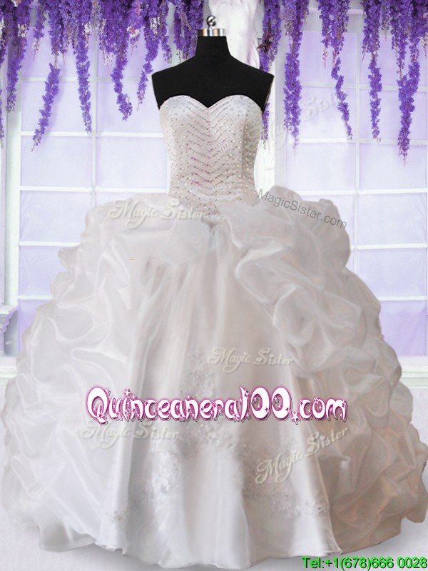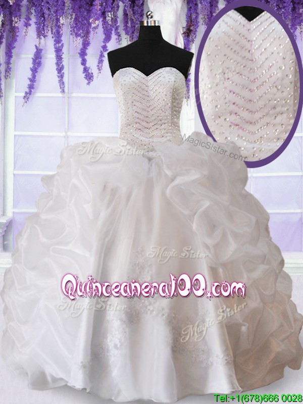 Neckline : SweetheartShown Color : WhiteSilhouette : Ball GownsSleeve Length : sleevelessHemline : floor lengthBack Detail : Lace upFabric : OrganzaEmbellishment : Beading,Appliques,Pick UpsOccasion : Military Ball,Sweet 16,QuinceaneraSeason : Spring,Summer,Fall,Winter