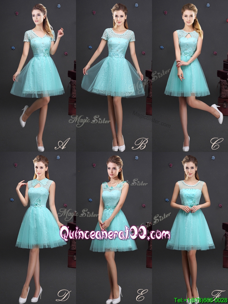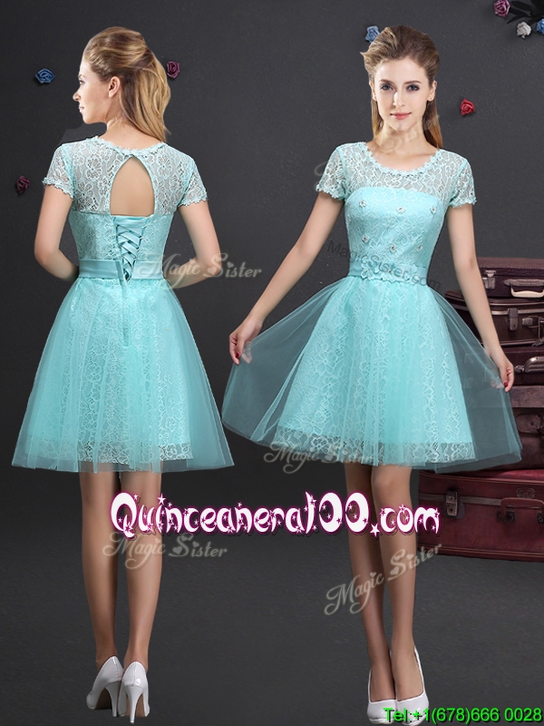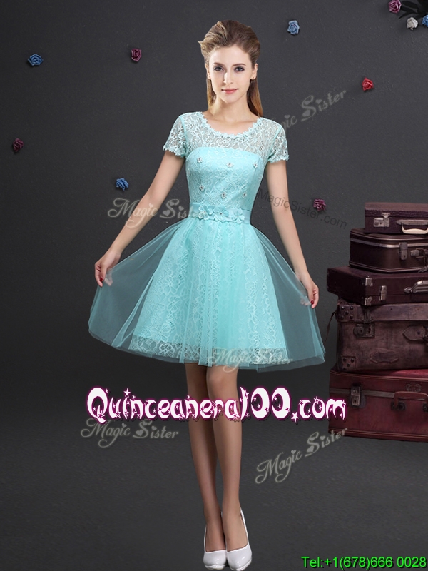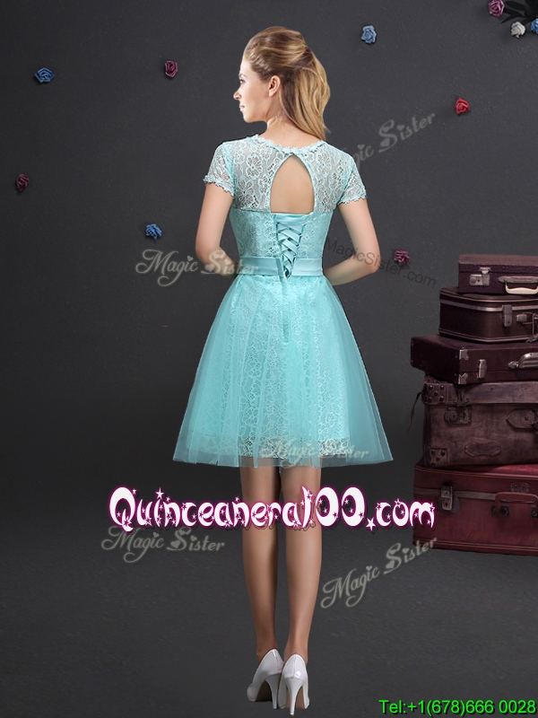Neckline : Scoop Shown Color : Aqua Blue Sleeve Length : short sleeves Hemline : mini length Back Detail : Lace up Fabric : Tulle Embellishment : Lace,Appliques,Belt Occasion : Prom,Party Season : Spring,Summer,Fall