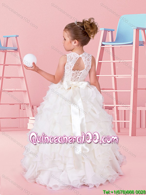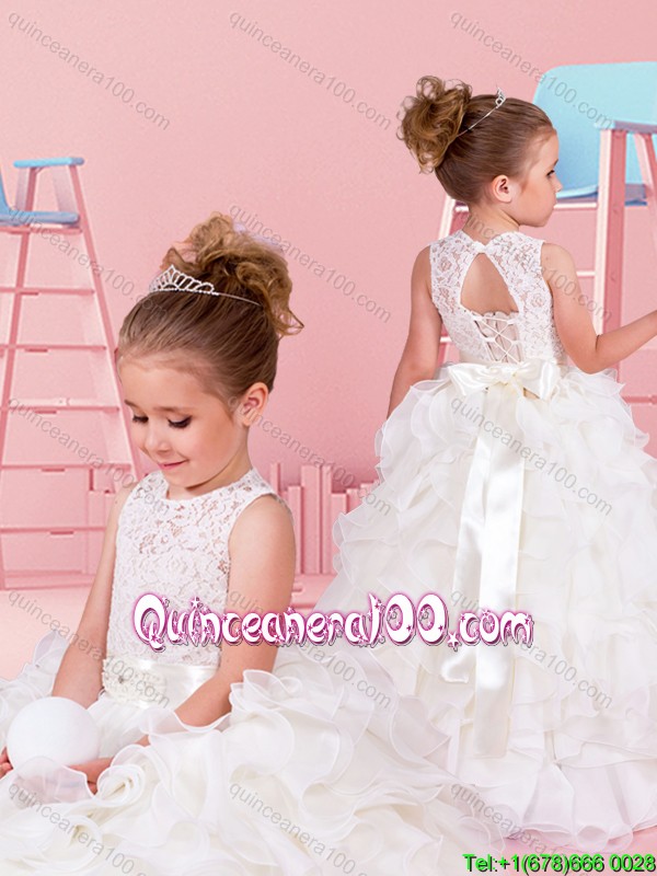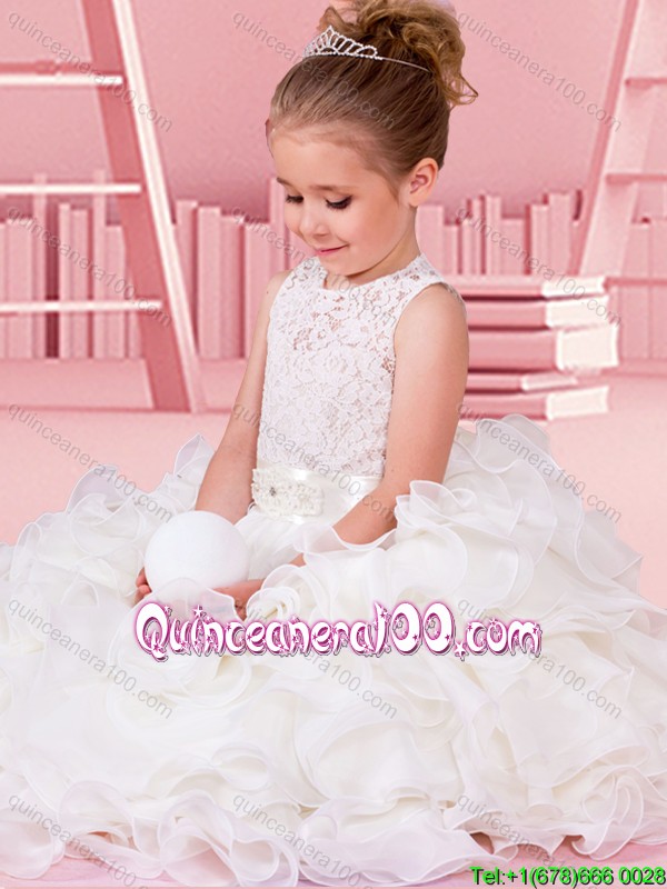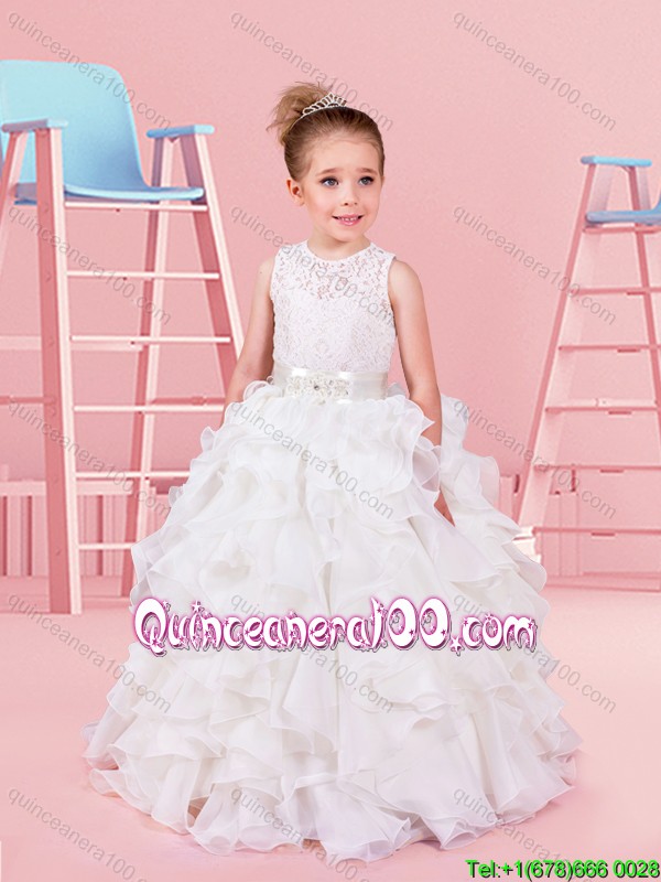 Neckline : ScoopShown Color : WhiteSilhouette : A-lineSleeve Length : sleevelessHemline : floor lengthBack Detail : Lace upFabric : ChiffonEmbellishment : Lace,Ruffles,BeltOccasion : Quinceanera,Wedding PartySeason : Spring,Summer,Fall,Winter