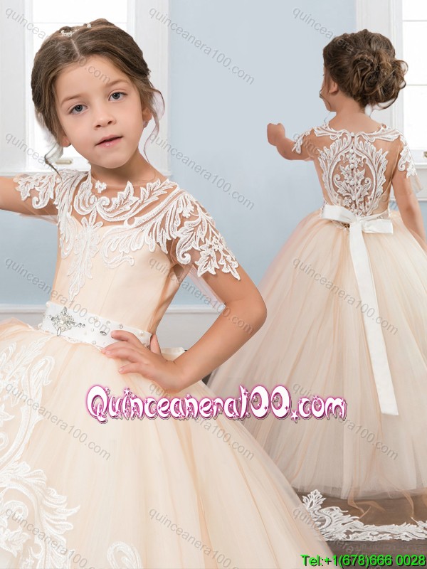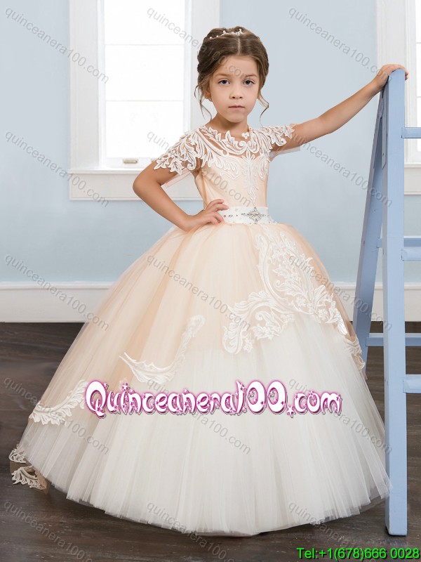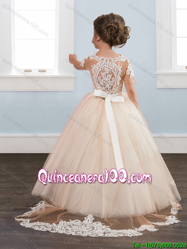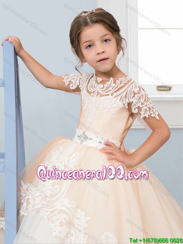 Classical See Through White and Pink Little Girl Pageant Dress with Short Sleeves