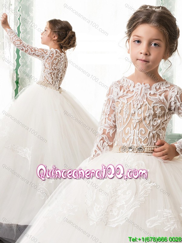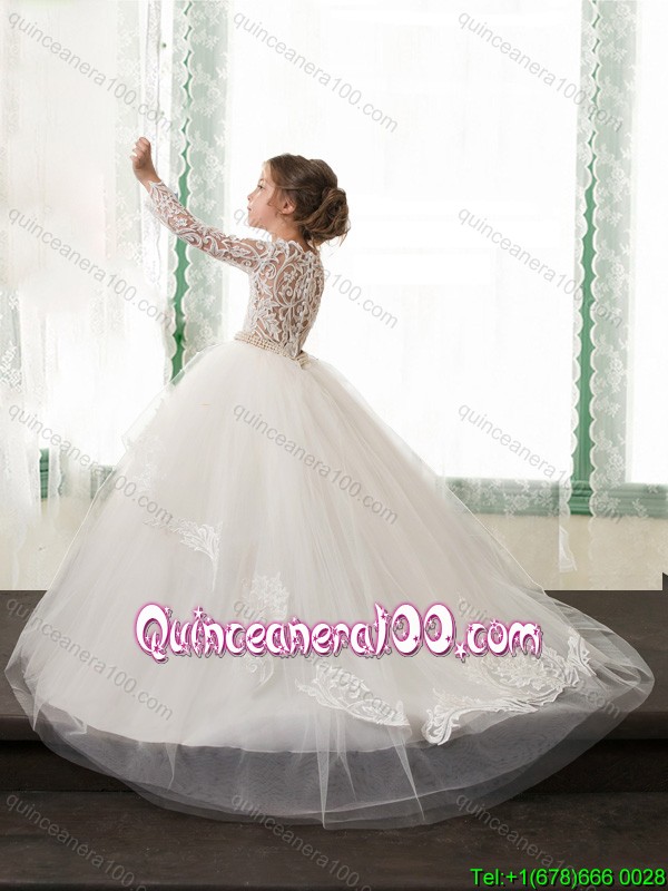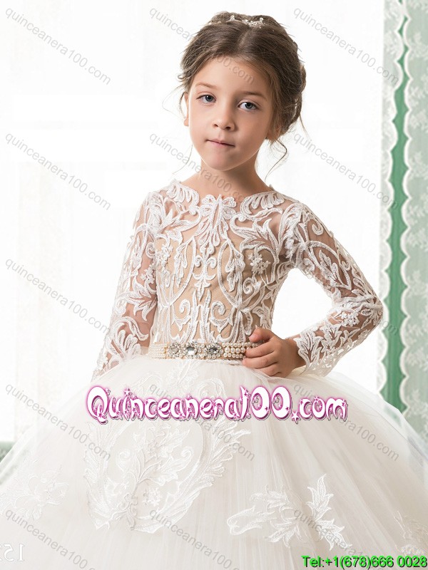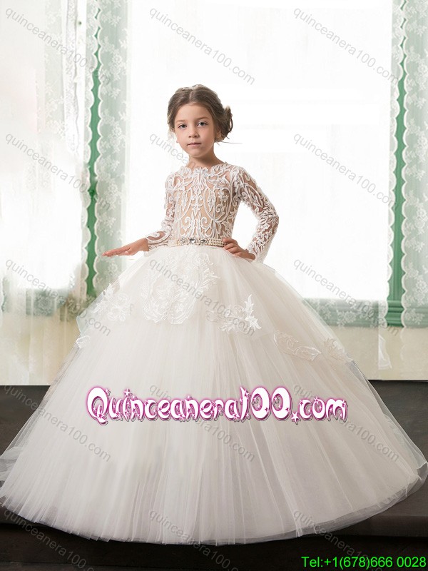 Neckline : ScoopShown Color : WhiteSilhouette : Ball GownsSleeve Length : long sleevesHemline : with trainBack Detail : Clasp handleFabric : TulleEmbellishment : Beading,LaceOccasion : Quinceanera,Wedding PartySeason : Spring,Summer,Fall,Winter