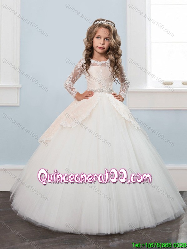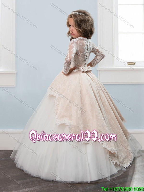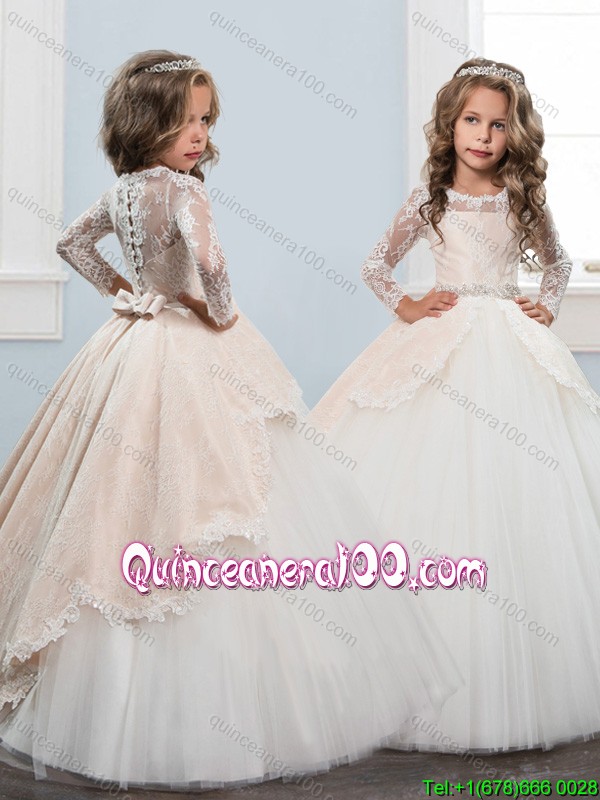 Neckline : ScoopShown Color : ChampagneSilhouette : Ball GownsSleeve Length : long sleevesHemline : floor lengthBack Detail : Clasp handleFabric : TulleEmbellishment : Beading,Lace,BowknotOccasion : Quinceanera,Wedding PartySeason : Spring,Summer,Fall,Winter