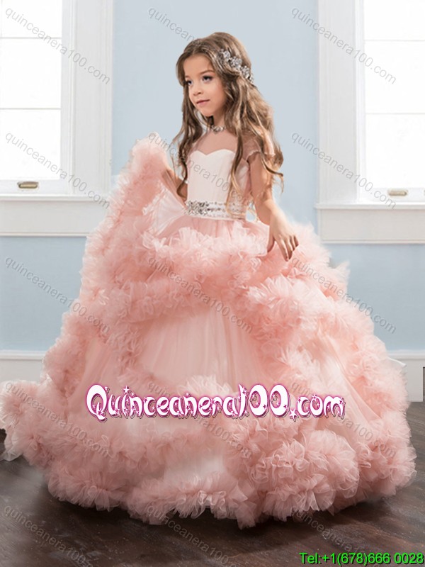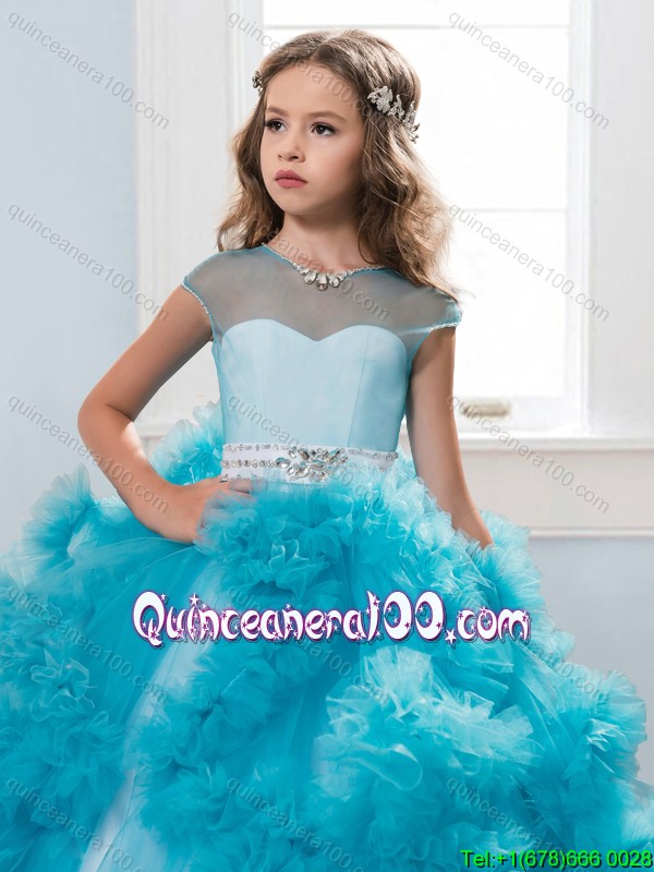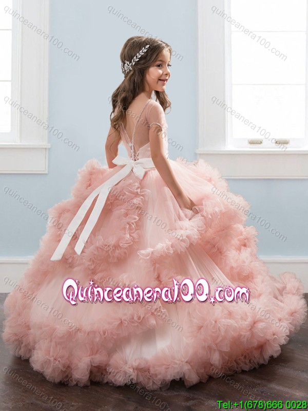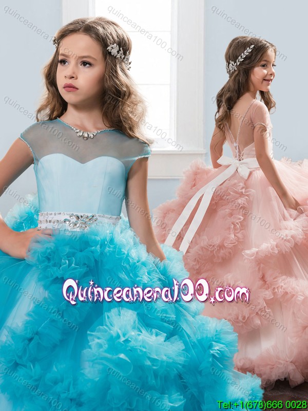 Neckline : ScoopShown Color : Baby Blue,PeachSilhouette : Ball GownsSleeve Length : short sleevesHemline : floor lengthBack Detail : BacklessFabric : TulleEmbellishment : Beading,RufflesOccasion : Quinceanera,Wedding PartySeason : Spring,Summer,Fall,Winter