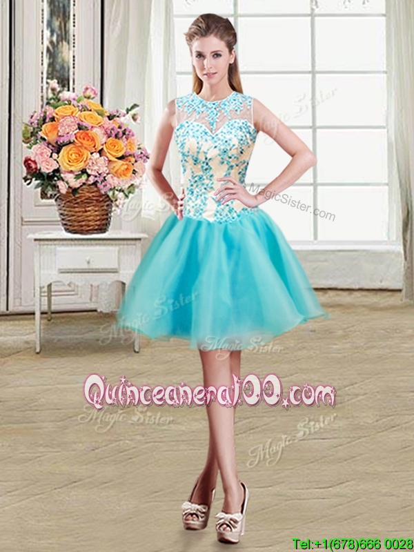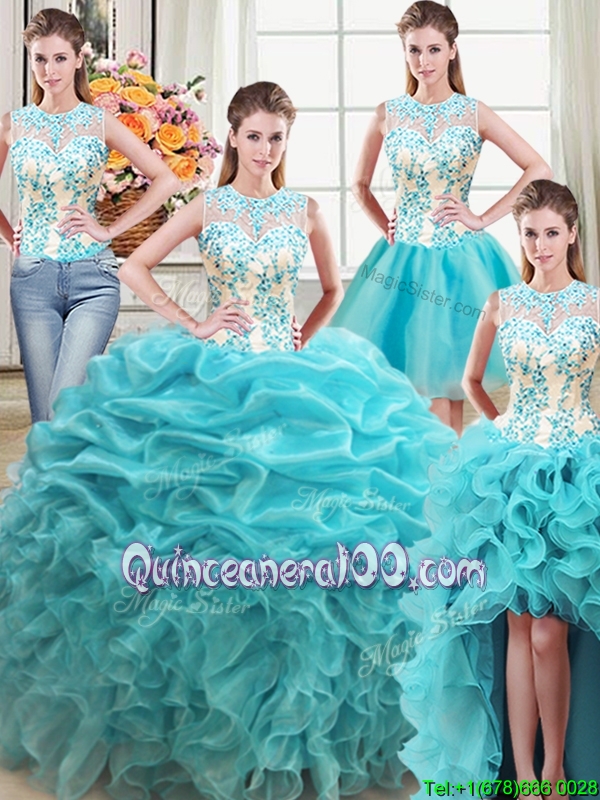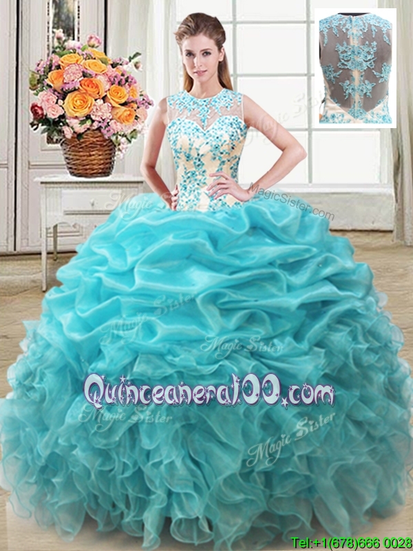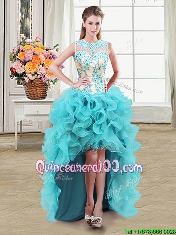 Neckline : High-neckShown Color : Aqua BlueSleeve Length : sleevelessHemline : floor lengthBack Detail : ZipperFabric : OrganzaEmbellishment : Beading,RufflesOccasion : Military Ball,QuinceaneraSeason : Spring,Summer,Fall,Winter