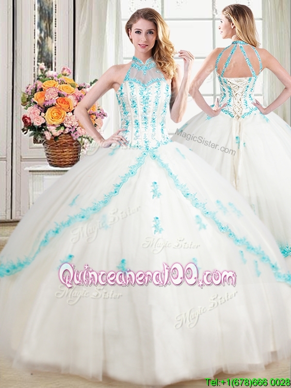 Neckline : Halter topShown Color : WhiteSilhouette : Ball GownsSleeve Length : sleevelessHemline : floor lengthBack Detail : Lace upFabric : TulleEmbellishment : Beading,AppliquesOccasion : Military Ball,Sweet 16,QuinceaneraSeason : Spring,Summer,Fall,Winter