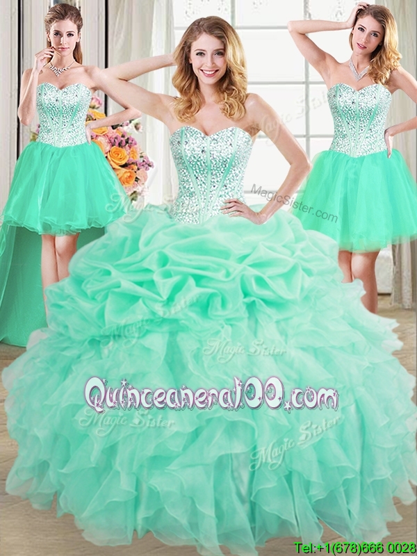Neckline : SweetheartShown Color : Apple GreenSilhouette : Ball GownsSleeve Length : sleevelessHemline : floor lengthBack Detail : Lace upFabric : OrganzaEmbellishment : Beading,Ruffles,Pick UpsOccasion : Military Ball,Sweet 16,QuinceaneraSeason : Spring,Summer,Fall,Winter