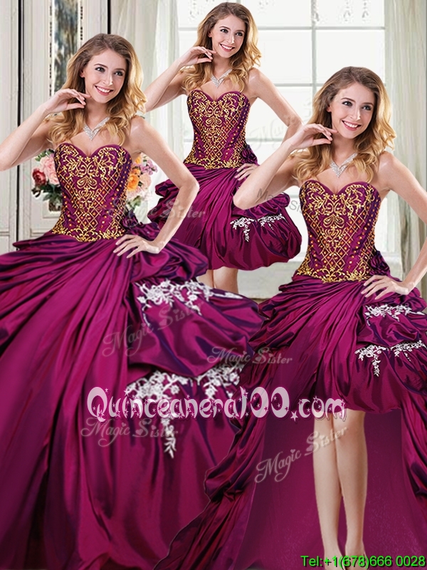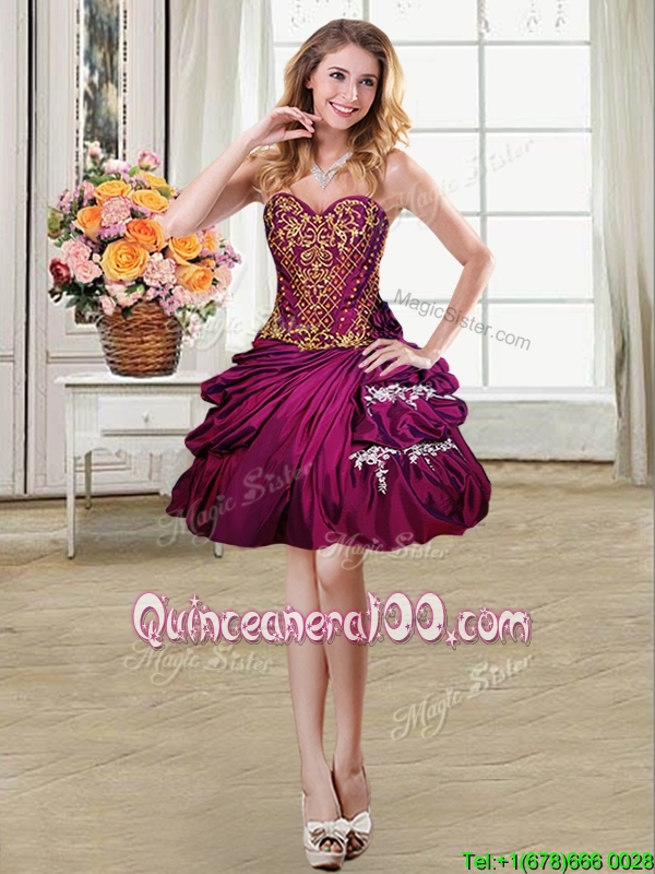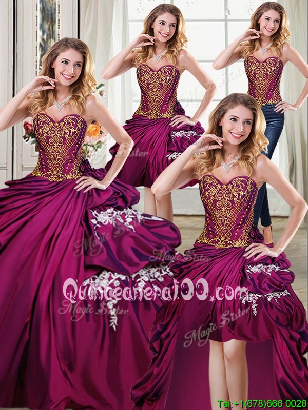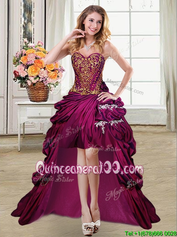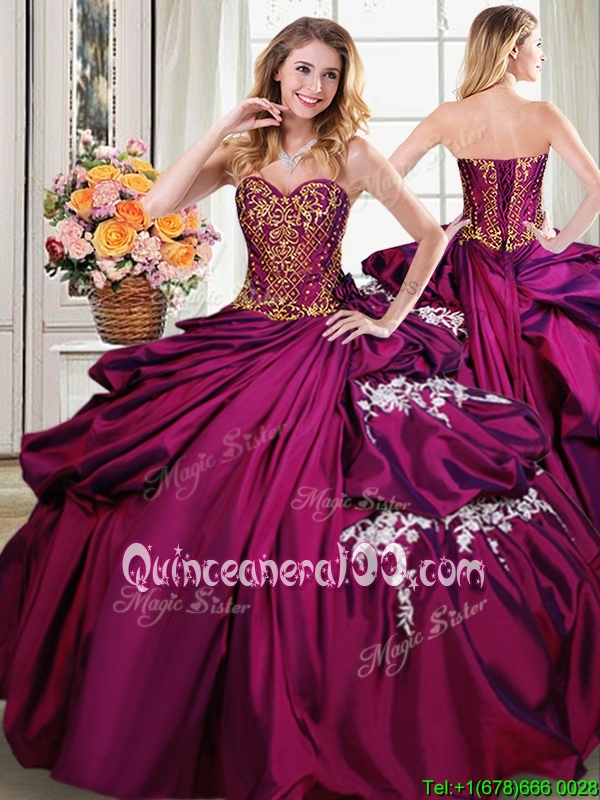 Neckline : SweetheartShown Color : BurgundySilhouette : Ball GownsSleeve Length : sleevelessHemline : floor lengthBack Detail : Lace upFabric : TaffetaEmbellishment : Beading,Appliques,Pick UpsOccasion : Military Ball,Sweet 16,QuinceaneraSeason : Spring,Summer,Fall,Winter