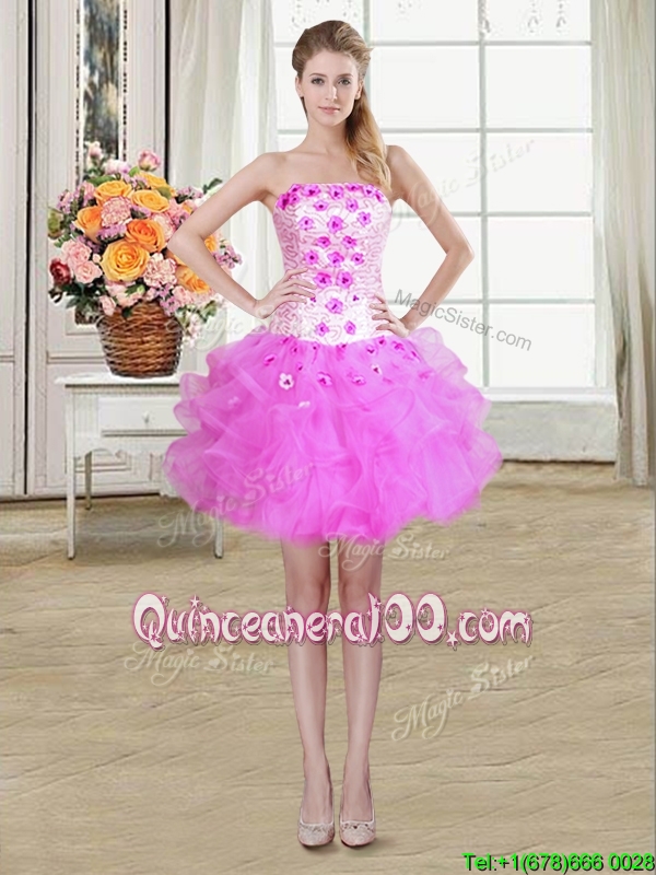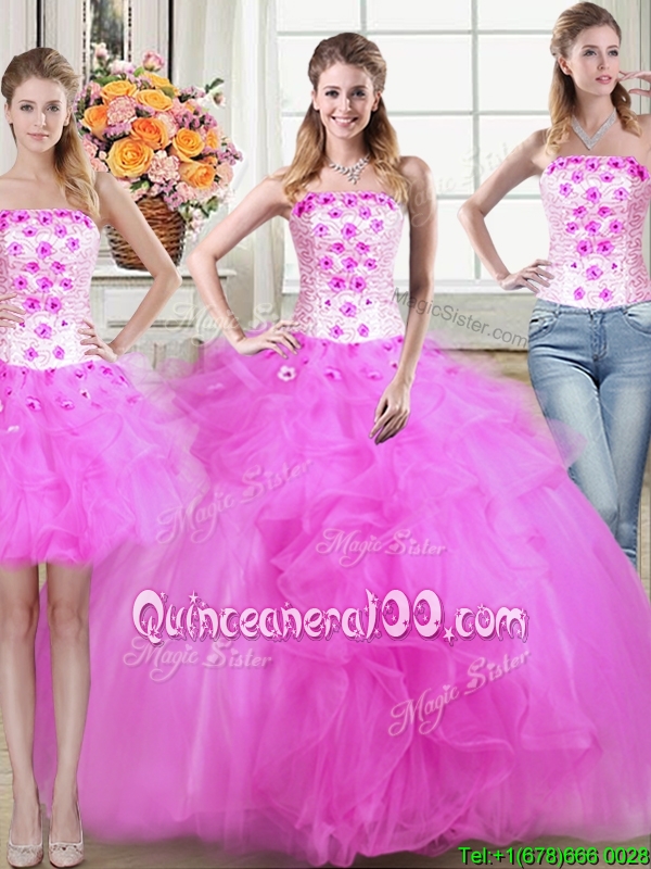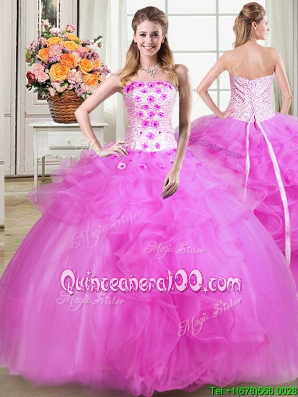 Neckline : StraplessShown Color : FuchsiaSilhouette : Ball GownsSleeve Length : sleevelessHemline : floor lengthBack Detail : Lace upFabric : TulleEmbellishment : Beading,Appliques,RufflesOccasion : Military Ball,Sweet 16,QuinceaneraSeason : Spring,Summer,Fall,Winter