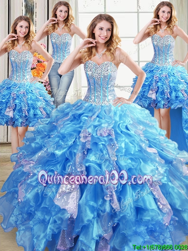 Neckline : SweetheartShown Color : Baby BlueSilhouette : Ball GownsSleeve Length : sleevelessHemline : floor lengthBack Detail : Lace upFabric : OrganzaEmbellishment : Beading,RufflesOccasion : Prom,Sweet 16,QuinceaneraSeason : Spring,Summer,Fall,Winter