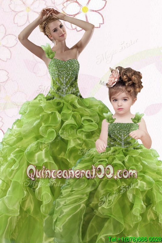 Unique Green Ball Gowns One Shoulder Sleeveless Organza Floor Length Lace Up Beading and Ruffles Quinceanera Gowns