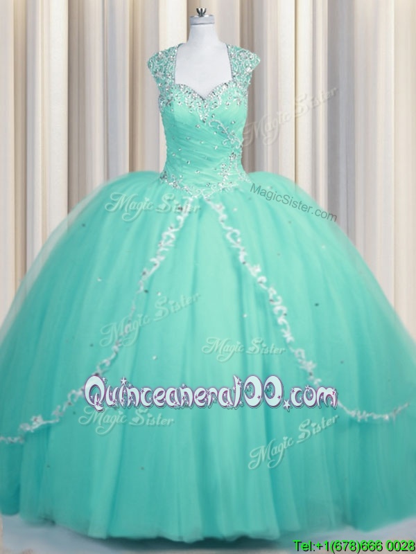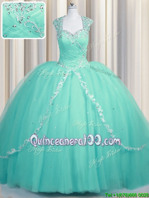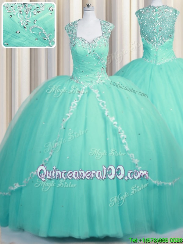 Neckline : SweetheartShown Color : Aqua BlueSilhouette : Ball GownsSleeve Length : cap sleevesBack Detail : ZipperFabric : TulleEmbellishment : Beading,AppliquesOccasion : Military Ball,Sweet 16,QuinceaneraSeason : Spring,Summer,Fall,Winter