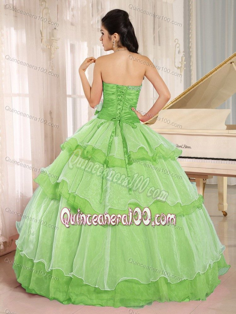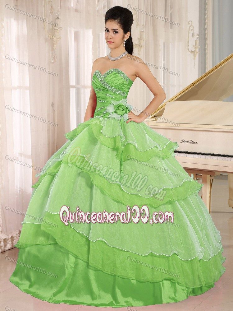 Apple Green Beaded Ruffled Quinceanera Dresses with Flower