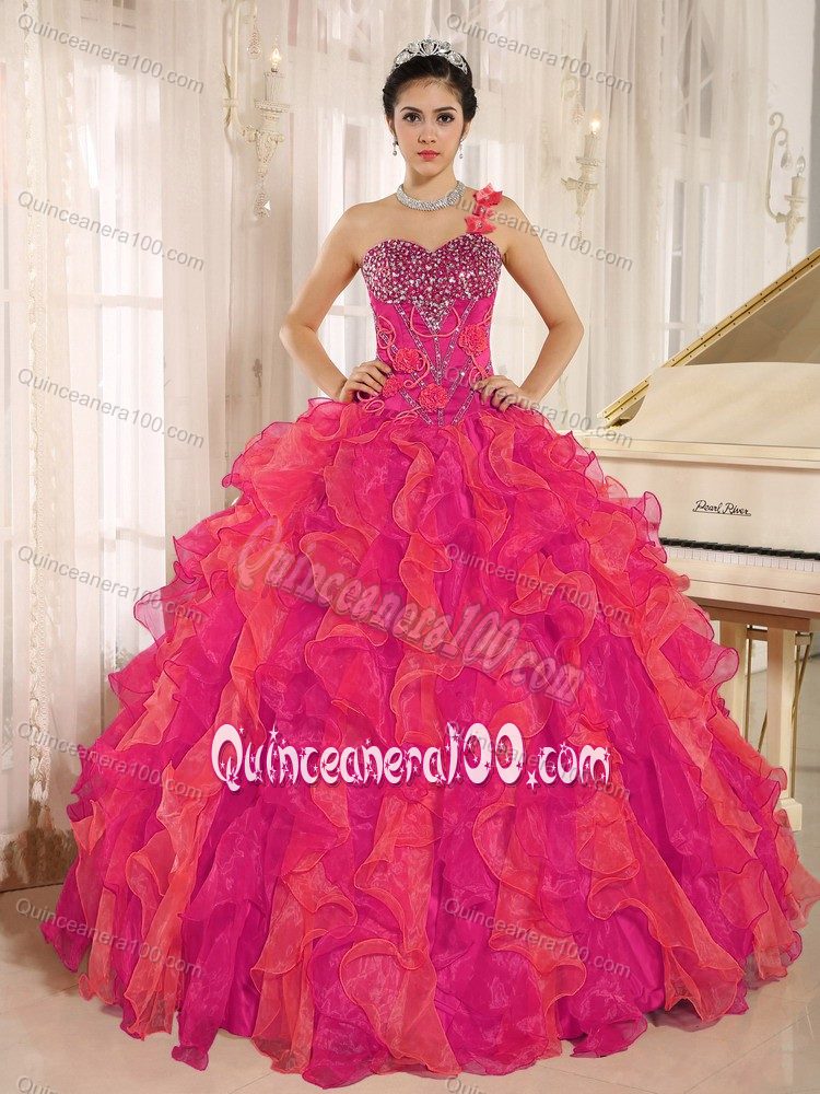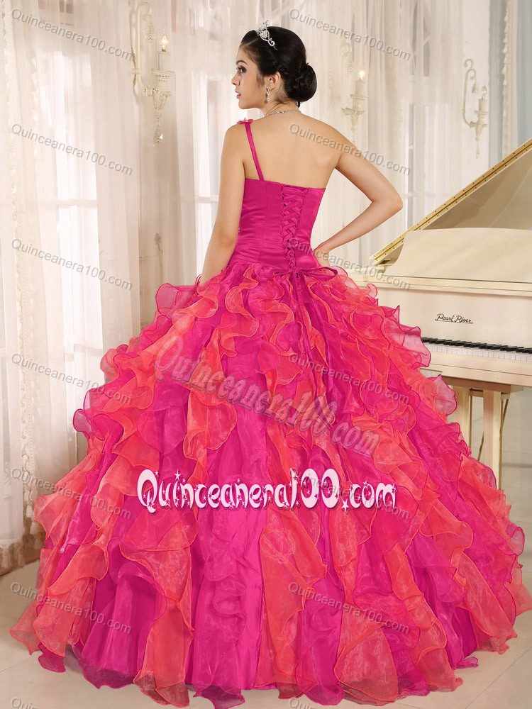 Neckline : One shoulderShown Color : Hot PinkSilhouette : Ball GownsSleeve Length : sleevelessHemline : floor lengthBack Detail : Lace upFabric : OrganzaEmbellishment : Beading,RufflesOccasion : Sweet 16,QuinceaneraSeason : Spring,Summer,Fall,Winter