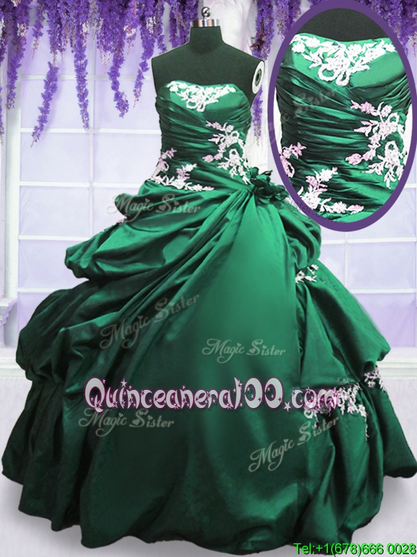 Neckline : StraplessShown Color : Green,Dark GreenSilhouette : Ball GownsSleeve Length : sleevelessHemline : floor lengthBack Detail : Lace upFabric : TaffetaEmbellishment : Appliques,Pick UpsOccasion : Military Ball,Sweet 16,QuinceaneraSeason : Spring,Summer,Fall,Winter