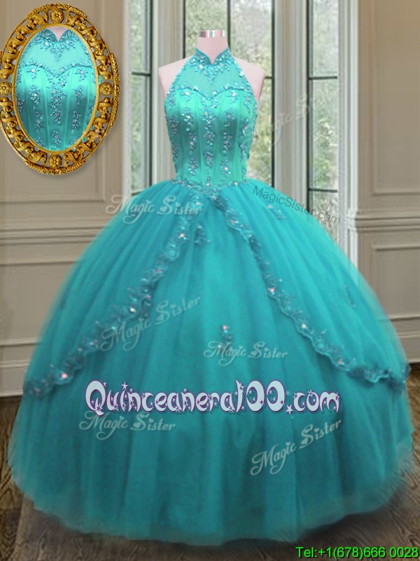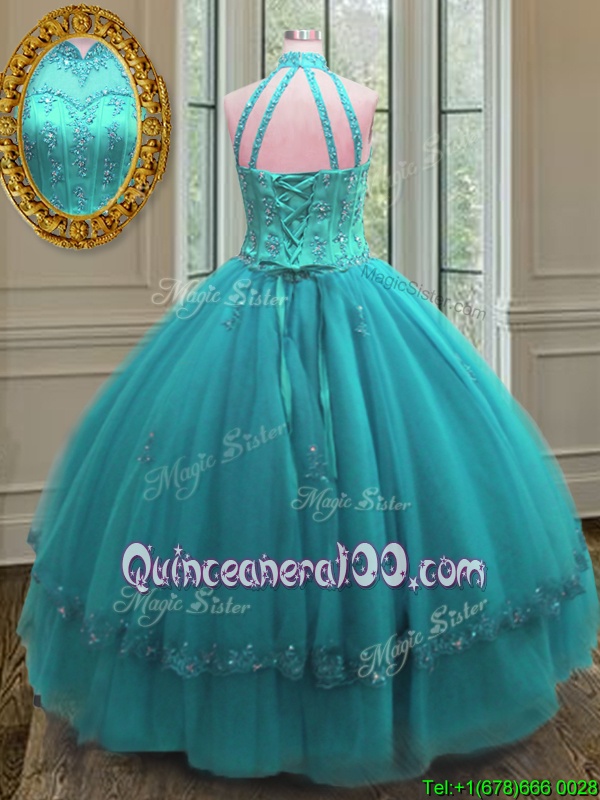 Neckline : High-neckShown Color : Aqua BlueSilhouette : Ball GownsSleeve Length : sleevelessHemline : floor lengthBack Detail : Lace upFabric : TulleEmbellishment : Beading,AppliquesOccasion : Military Ball,Sweet 16,QuinceaneraSeason : Spring,Summer,Fall,Winter