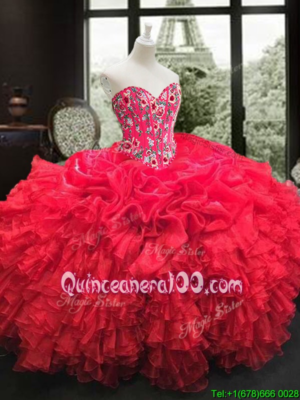 Neckline : SweetheartShown Color : RedSilhouette : Ball GownsSleeve Length : sleevelessHemline : floor lengthBack Detail : Lace upFabric : OrganzaEmbellishment : Embroidery,RufflesOccasion : Military Ball,Sweet 16,QuinceaneraSeason : Spring,Summer,Fall,Winter
