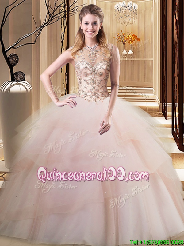 Neckline : ScoopShown Color : PeachSilhouette : Ball GownsSleeve Length : sleevelessBack Detail : Lace upFabric : TulleEmbellishment : Beading,Ruffled LayersOccasion : Military Ball,Sweet 16,QuinceaneraSeason : Spring,Summer,Fall,Winter