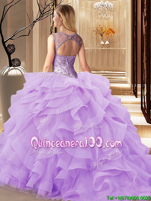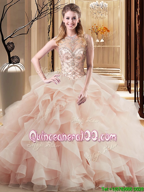 Neckline : ScoopShown Color : PeachSilhouette : Ball GownsSleeve Length : sleevelessBack Detail : Lace upFabric : TulleEmbellishment : Beading,RufflesOccasion : Military Ball,Sweet 16,QuinceaneraSeason : Spring,Summer,Fall,Winter