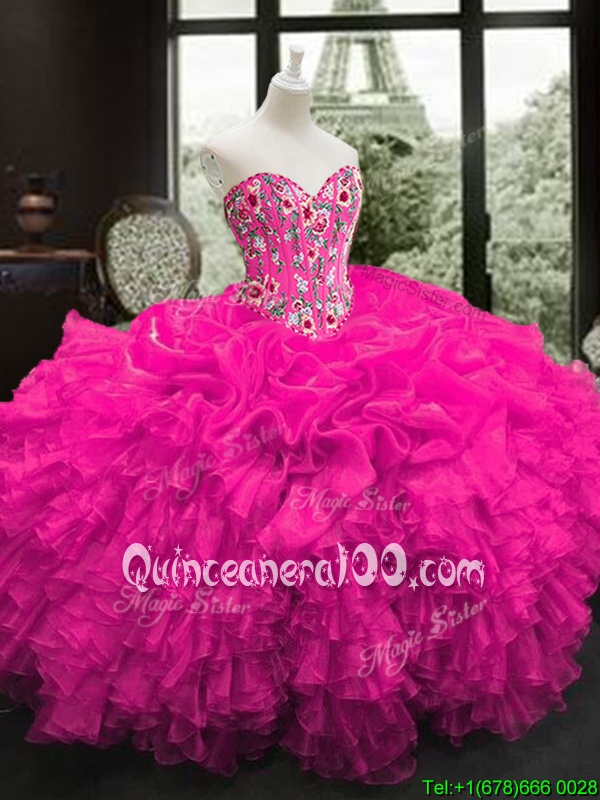 Neckline : SweetheartShown Color : FuchsiaSilhouette : Ball GownsSleeve Length : sleevelessHemline : floor lengthBack Detail : Lace upFabric : OrganzaEmbellishment : Embroidery,RufflesOccasion : Military Ball,Sweet 16,QuinceaneraSeason : Spring,Summer,Fall,Winter