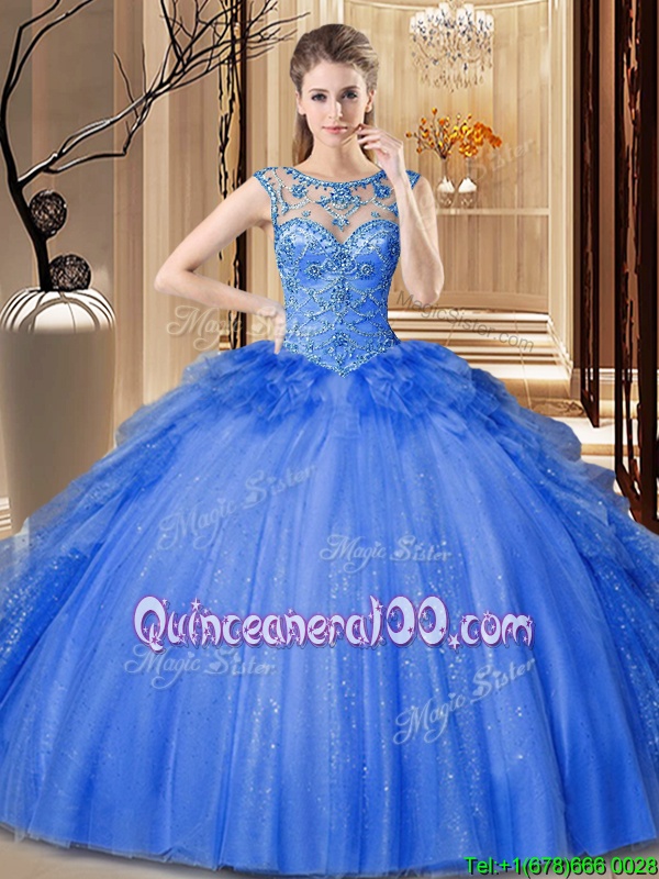 Neckline : ScoopShown Color : BlueSilhouette : Ball GownsSleeve Length : sleevelessHemline : floor lengthBack Detail : Lace upFabric : Tulle,SequinedEmbellishment : RufflesOccasion : Military Ball,Sweet 16,QuinceaneraSeason : Spring,Summer,Fall,Winter
