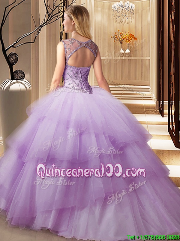 Neckline : ScoopShown Color : LilacSilhouette : Ball GownsSleeve Length : sleevelessBack Detail : Lace upFabric : TulleEmbellishment : Beading,Ruffled LayersOccasion : Military Ball,Sweet 16,QuinceaneraSeason : Spring,Summer,Fall,Winter