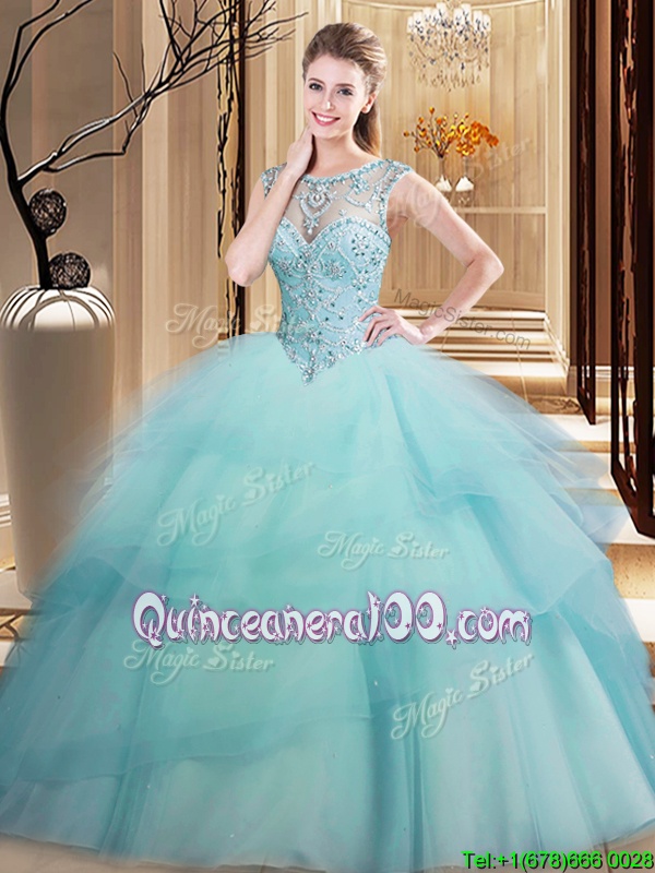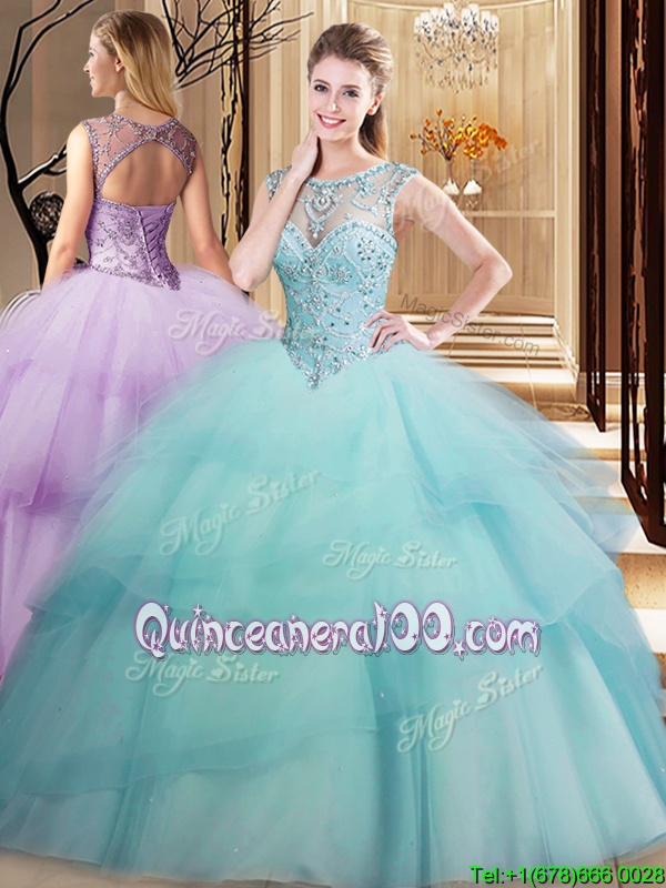 Neckline : ScoopShown Color : Light BlueSilhouette : Ball GownsSleeve Length : sleevelessBack Detail : Lace upFabric : TulleEmbellishment : Beading,Ruffled LayersOccasion : Military Ball,Sweet 16,QuinceaneraSeason : Spring,Summer,Fall,Winter