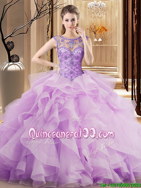 Neckline : ScoopShown Color : LavenderSilhouette : Ball GownsSleeve Length : sleevelessBack Detail : Lace upFabric : TulleEmbellishment : Beading,RufflesOccasion : Military Ball,Sweet 16,QuinceaneraSeason : Spring,Summer,Fall,Winter