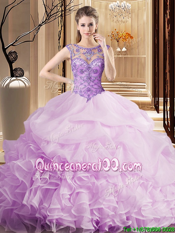 Neckline : ScoopShown Color : LilacSilhouette : Ball GownsSleeve Length : sleevelessBack Detail : Lace upFabric : OrganzaEmbellishment : Beading,Ruffles,Pick UpsOccasion : Military Ball,Sweet 16,QuinceaneraSeason : Spring,Summer,Fall,Winter